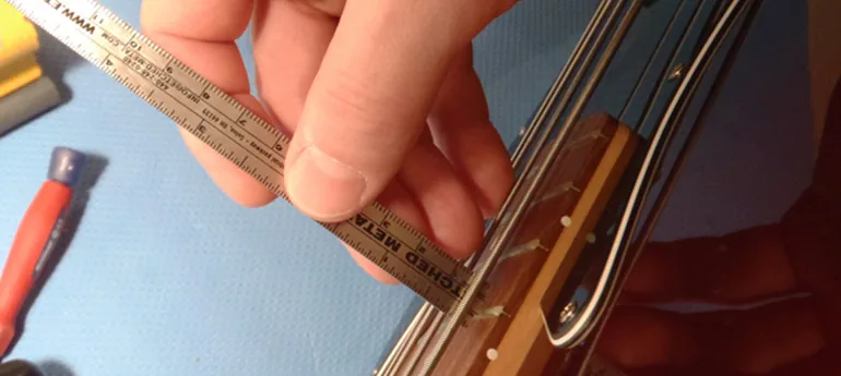 La hauteur des cordes — l’action — se règle au chevalet. Compromis entre jouabilité et son, adapté au style du musicien. Mesure prise à la 17e frette. Quand le manche n’accepte pas une action confortable, on regarde du côté des frettes (et on confie au luthier si nivelage nécessaire).