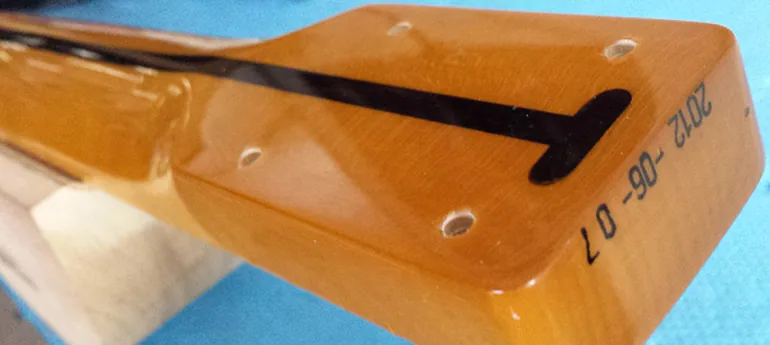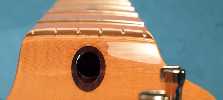 La barre de réglage (souvent appelée truss rod) ajuste la courbure du manche. Une légère courbe permet aux cordes de vibrer librement. Mesure prise à la 8e frette, entre la 1re et la dernière. C’est la fondation — tout le reste s’appuie dessus.